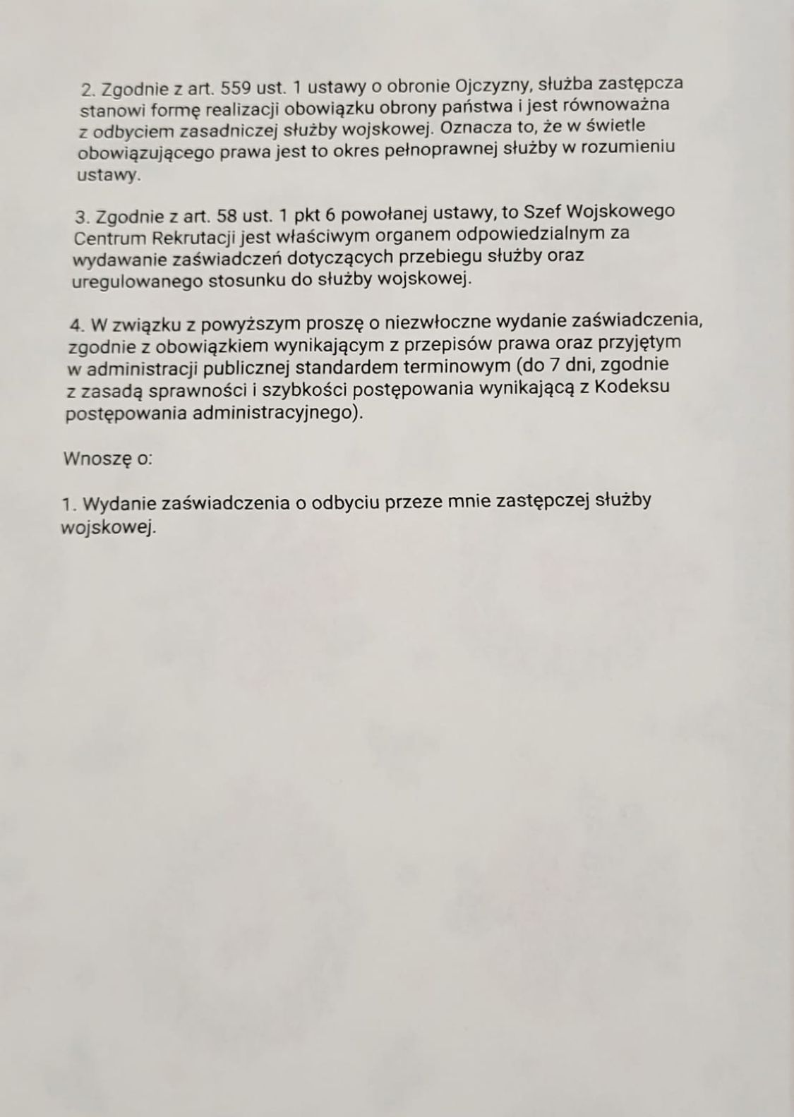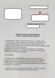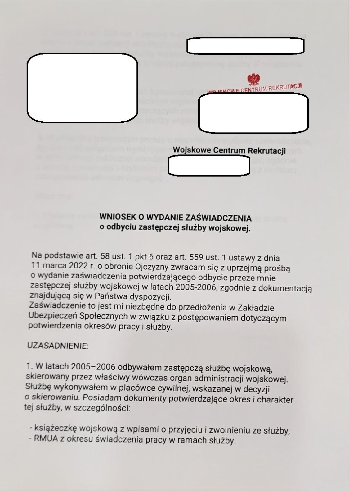 Wniosek o wydanie zaświadczenia o odbyciu zastępczej służby wojskowej